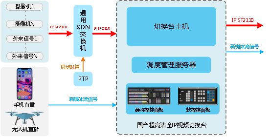 基于通用SDN交换机和软件定义体系架构,研发切换台调度管控软件,满足无压缩、低延迟4K IP视频信号调度应用需求,支持SMPTE ST 2110、SMPTE ST 2022-7、SMPTE ST 2059-2等标准;支持SDN交换机端口管理,流信号的管理和监测,实现视频数据、音频数据、辅助数据的一键式切换。